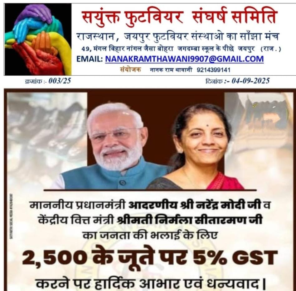 जयपुर, 10 सितंबर 2025। केंद्र सरकार द्वारा 2500 रुपए तक के फुटवियर पर GST को 5% करने के निर्णय का राजस्थान की संयुक्त फुटवियर संघर्ष समिति ने स्वागत करते हुए प्रधानमंत्री नरेंद्र मोदी और केंद्रीय वित्त मंत्री निर्मला सीतारमण को धन्यवाद ज्ञापित किया है।