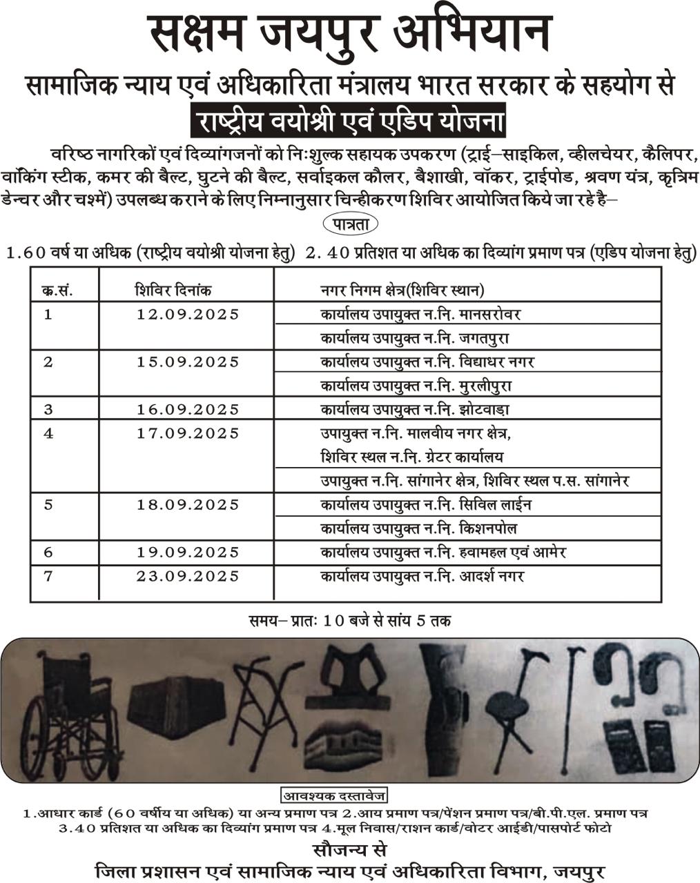 सक्षम जयपुर अभियान: नगर निगम ग्रेटर जयपुर जोन स्तर पर 12 सितंबर से लगाएगा शिविर September 10, 2025 Read More »
